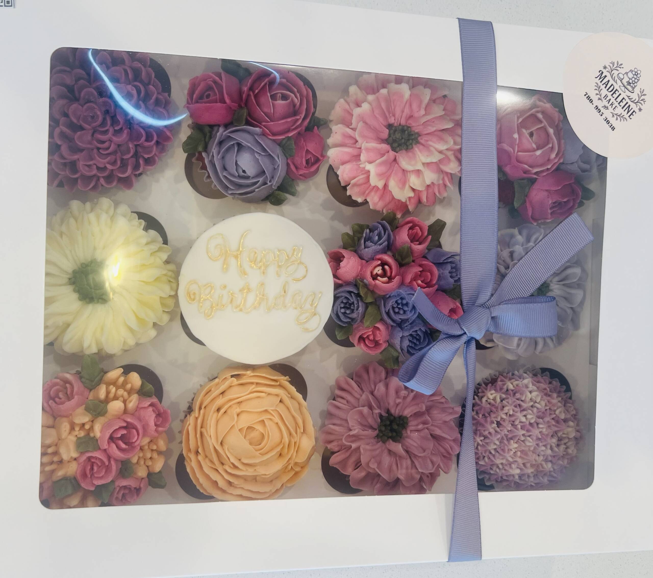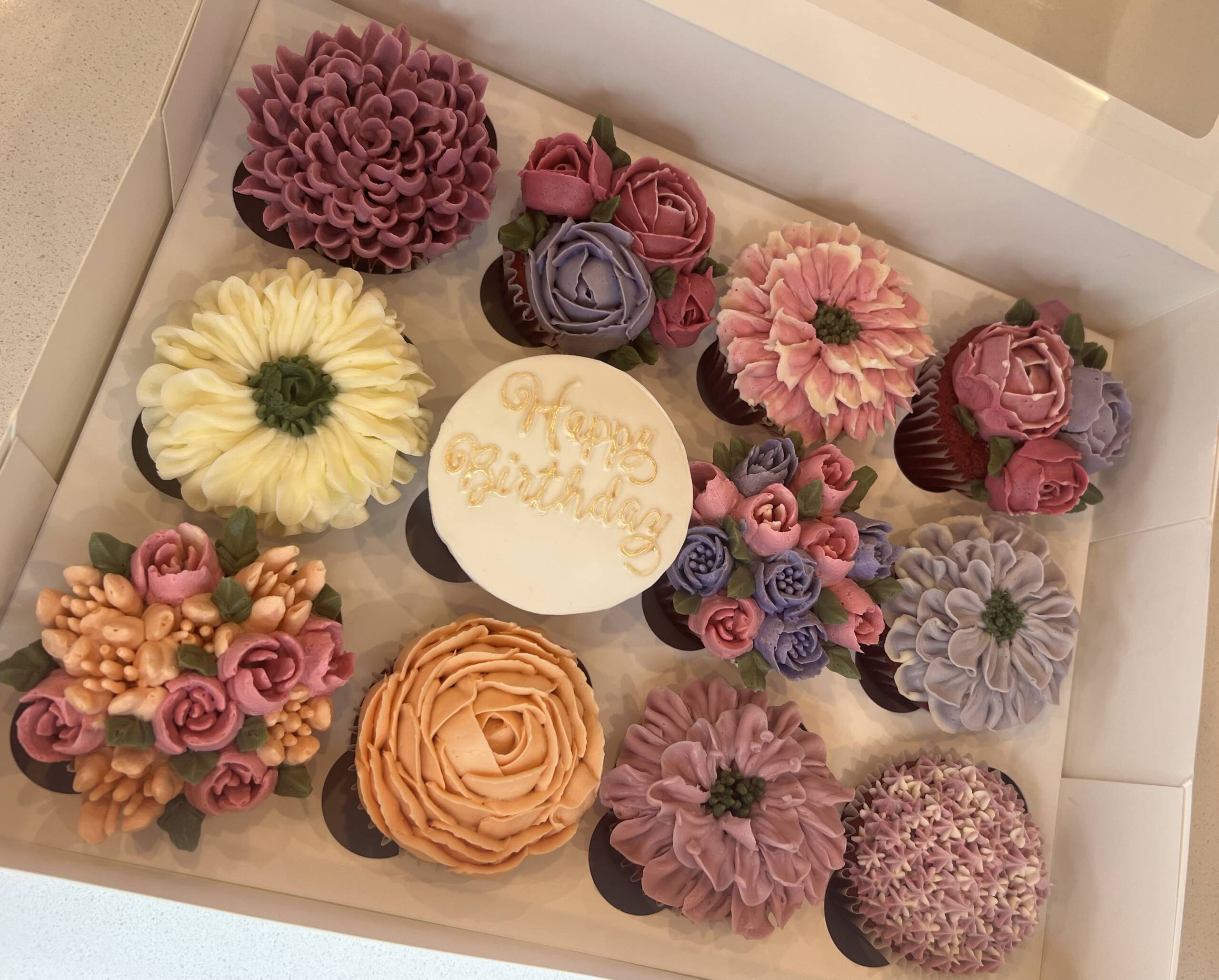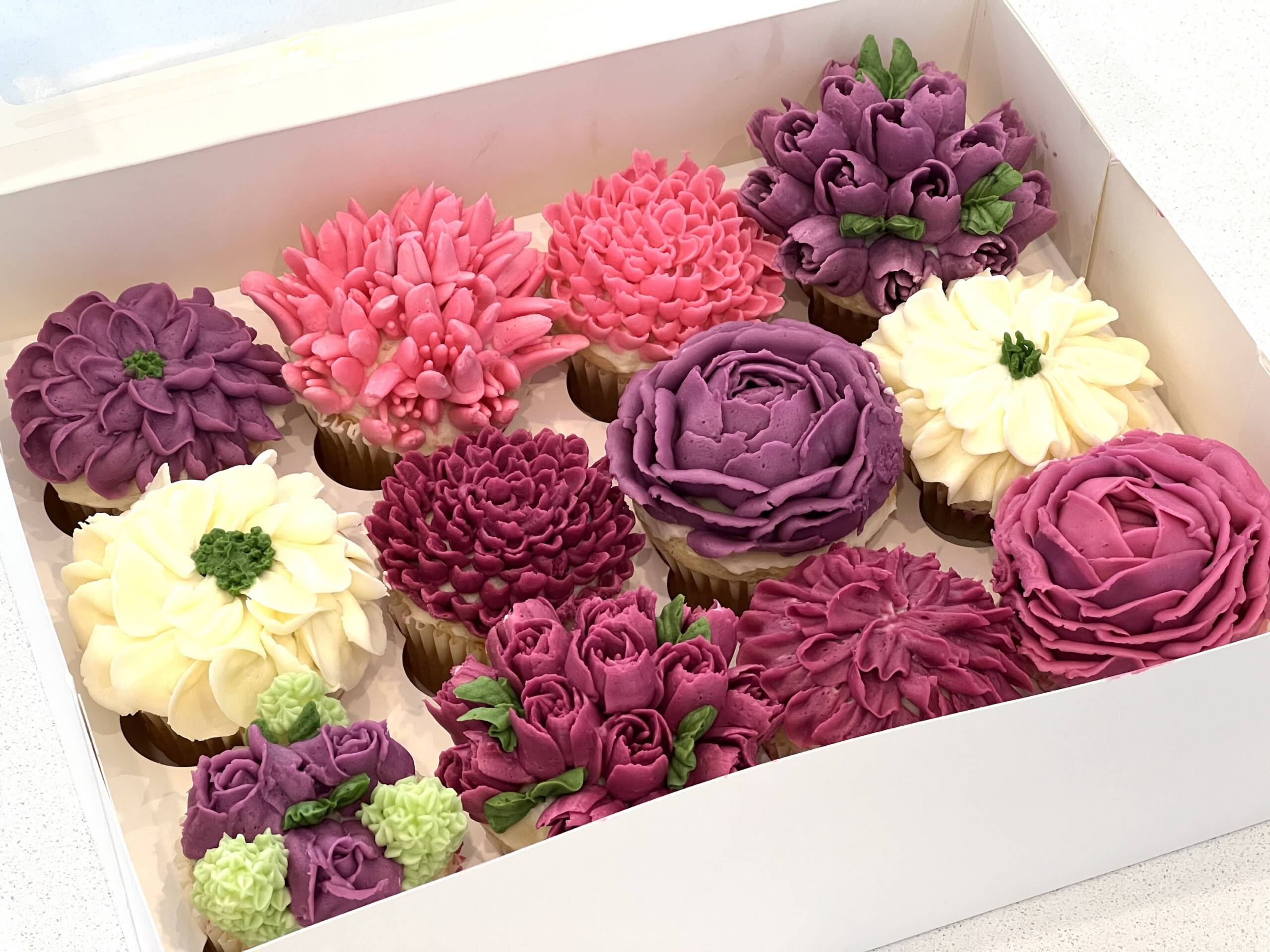 An elegant box of 12 floral cup cakes, beautifully decorated with buttercream flowers. Each cupcake is uniquely piped with intricate floral designs, creating a stunning bouquet-style presentation.