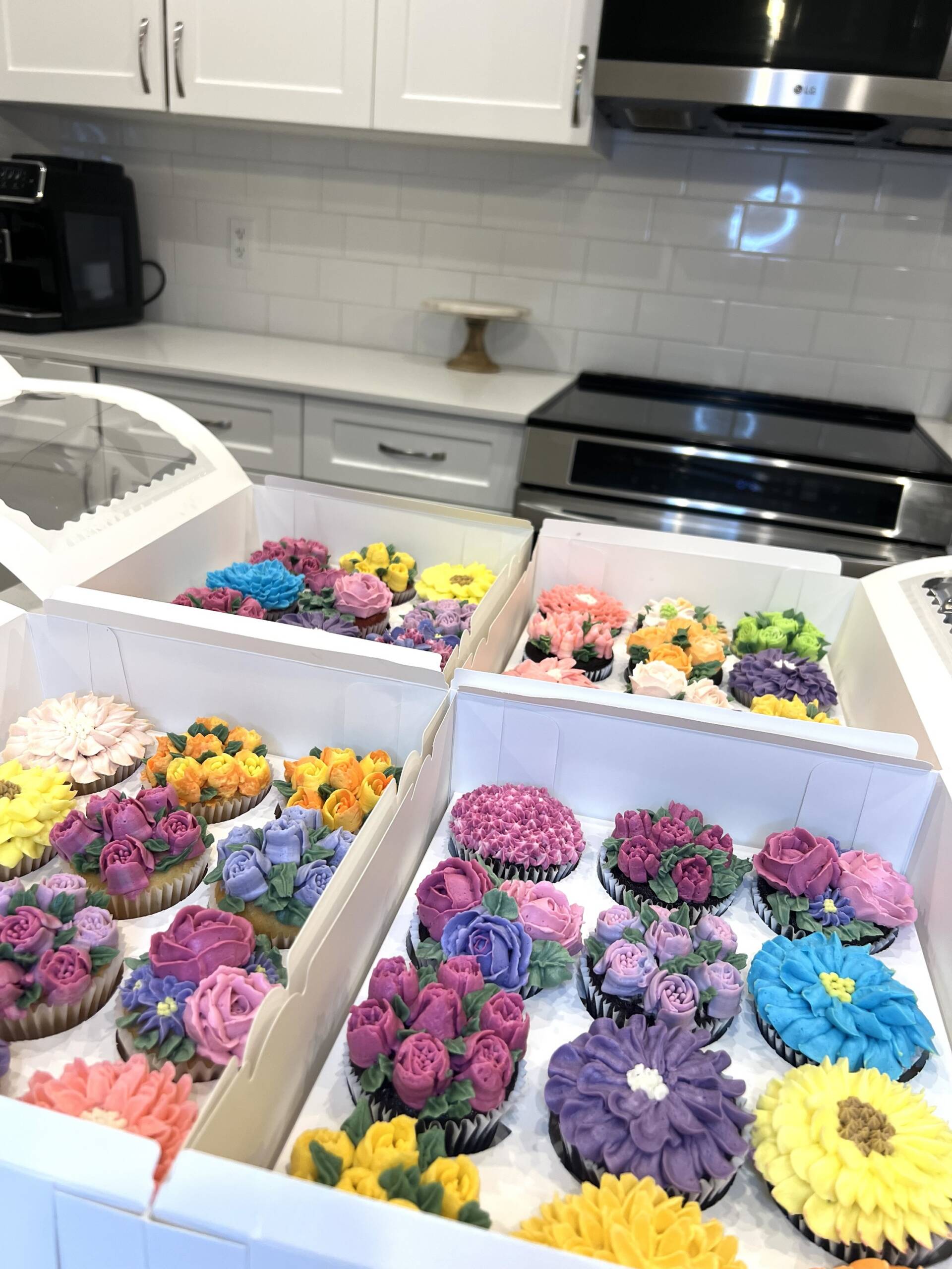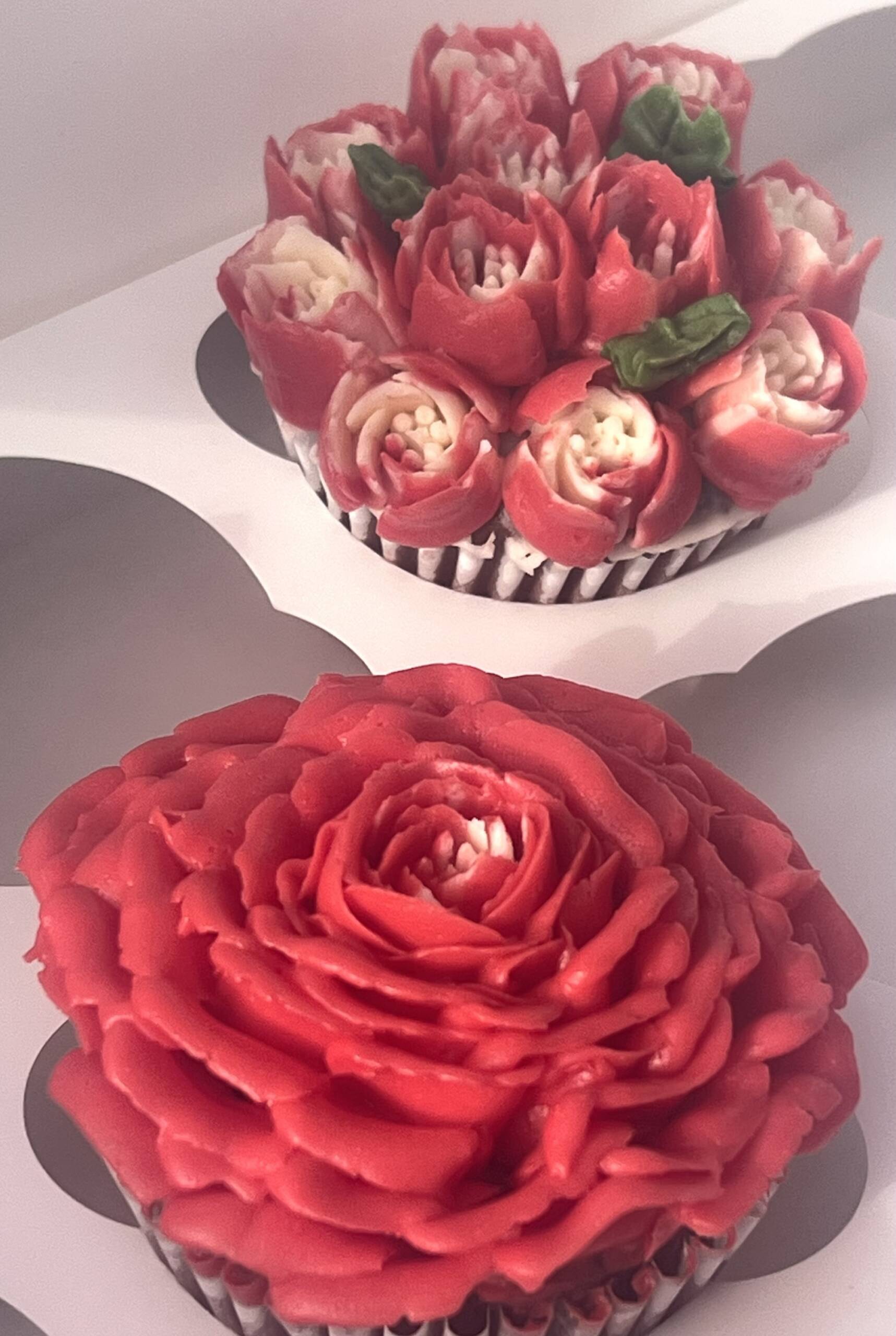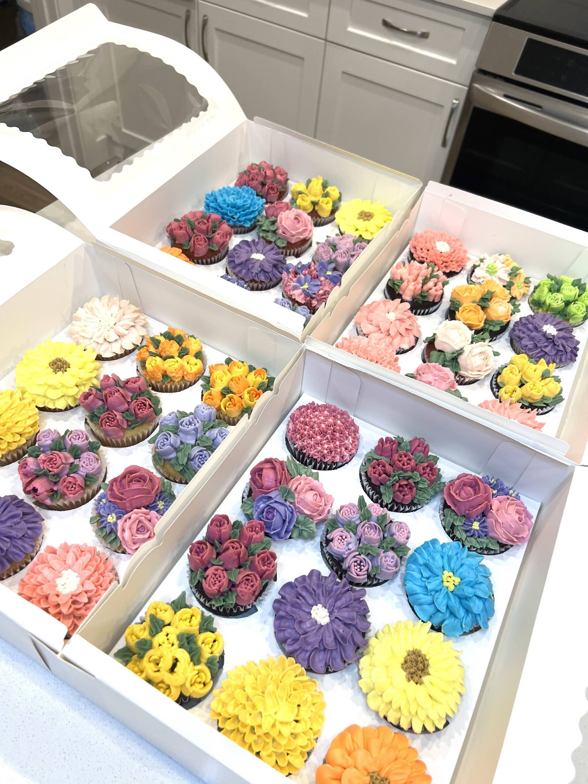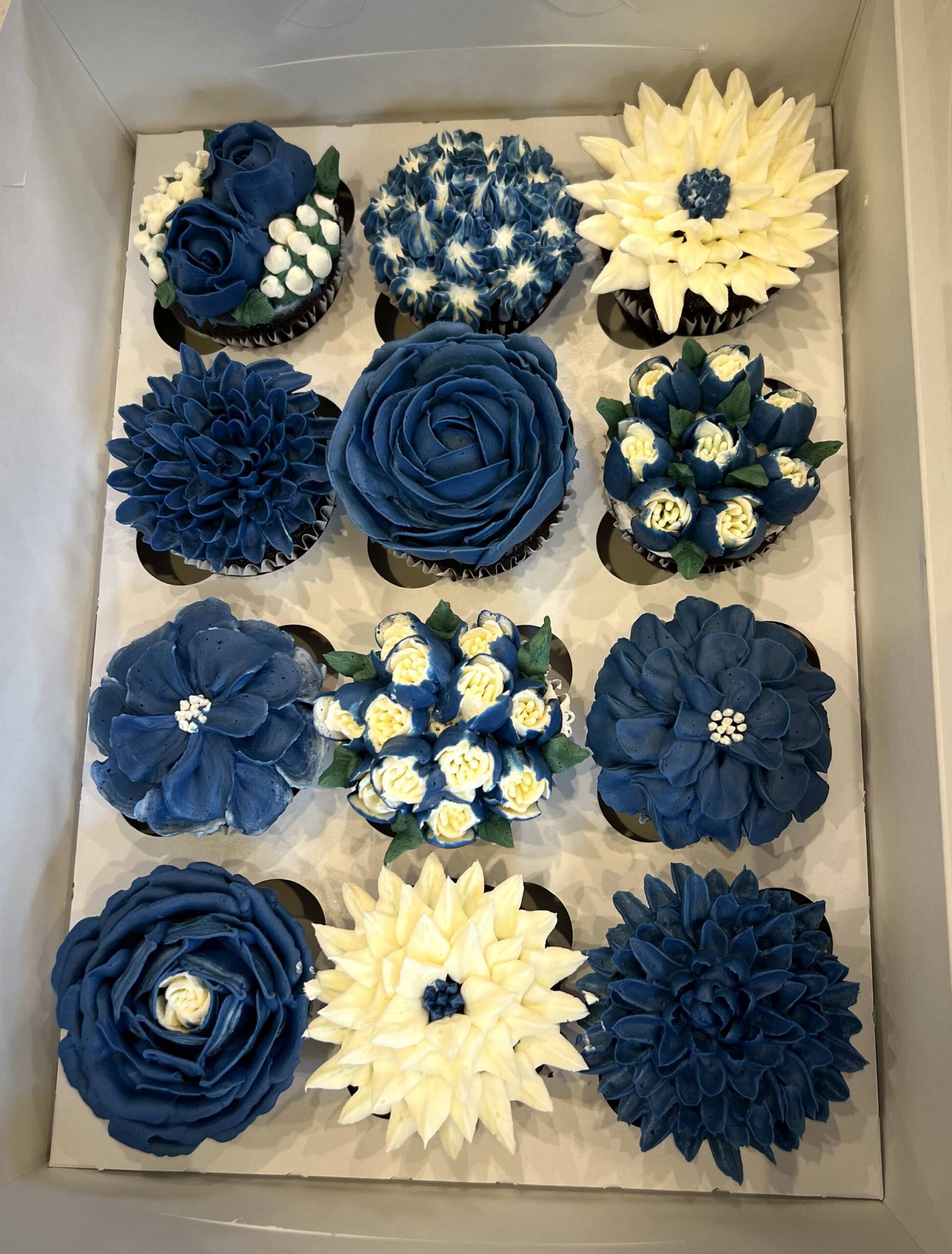 An elegant box of 12 floral cup cakes, beautifully decorated with buttercream flowers. Each cupcake is uniquely piped with intricate floral designs, creating a stunning bouquet-style presentation.