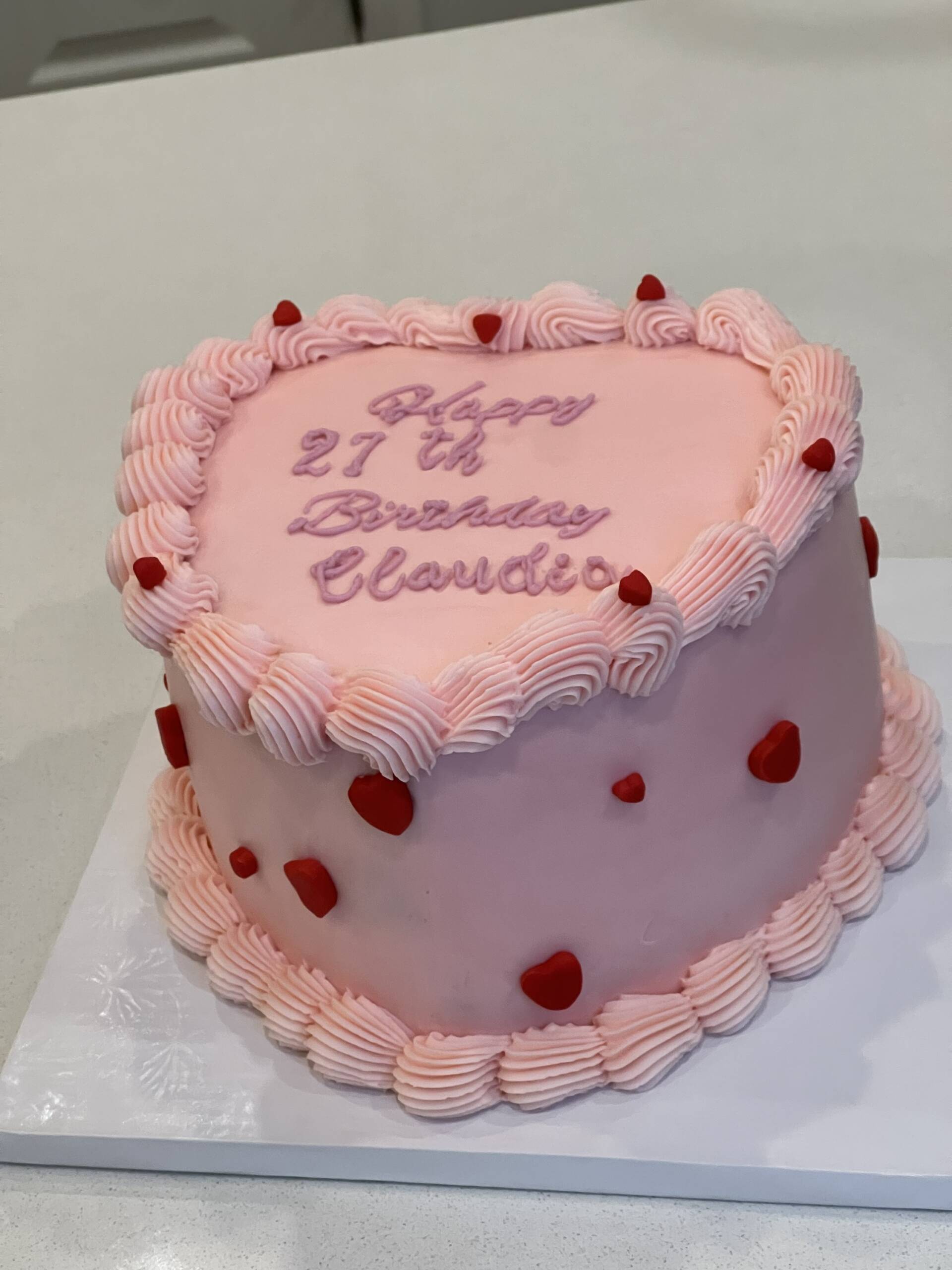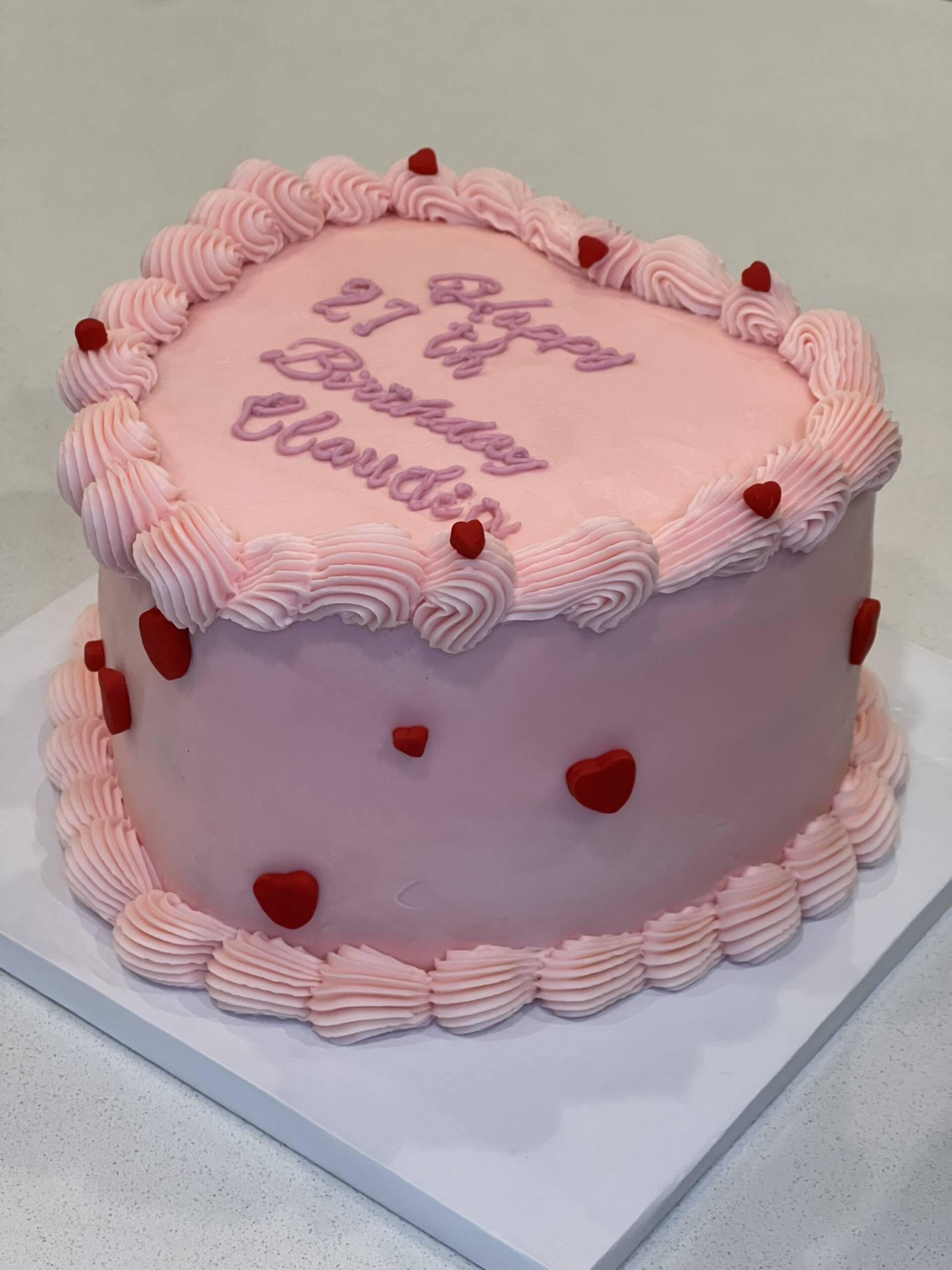 A beautiful heart-shaped cake designed to celebrate love and special moments. Finished with smooth pink fondant and decorated with soft hand-piped buttercream borders, this cake is accented with delicate red heart details for a romantic touch. Personalized with a custom birthday message on top, it’s a timeless and charming centerpiece—perfect for birthdays, anniversaries, or any celebration filled with love. Carefully crafted with attention to detail and made to create unforgettable memories.