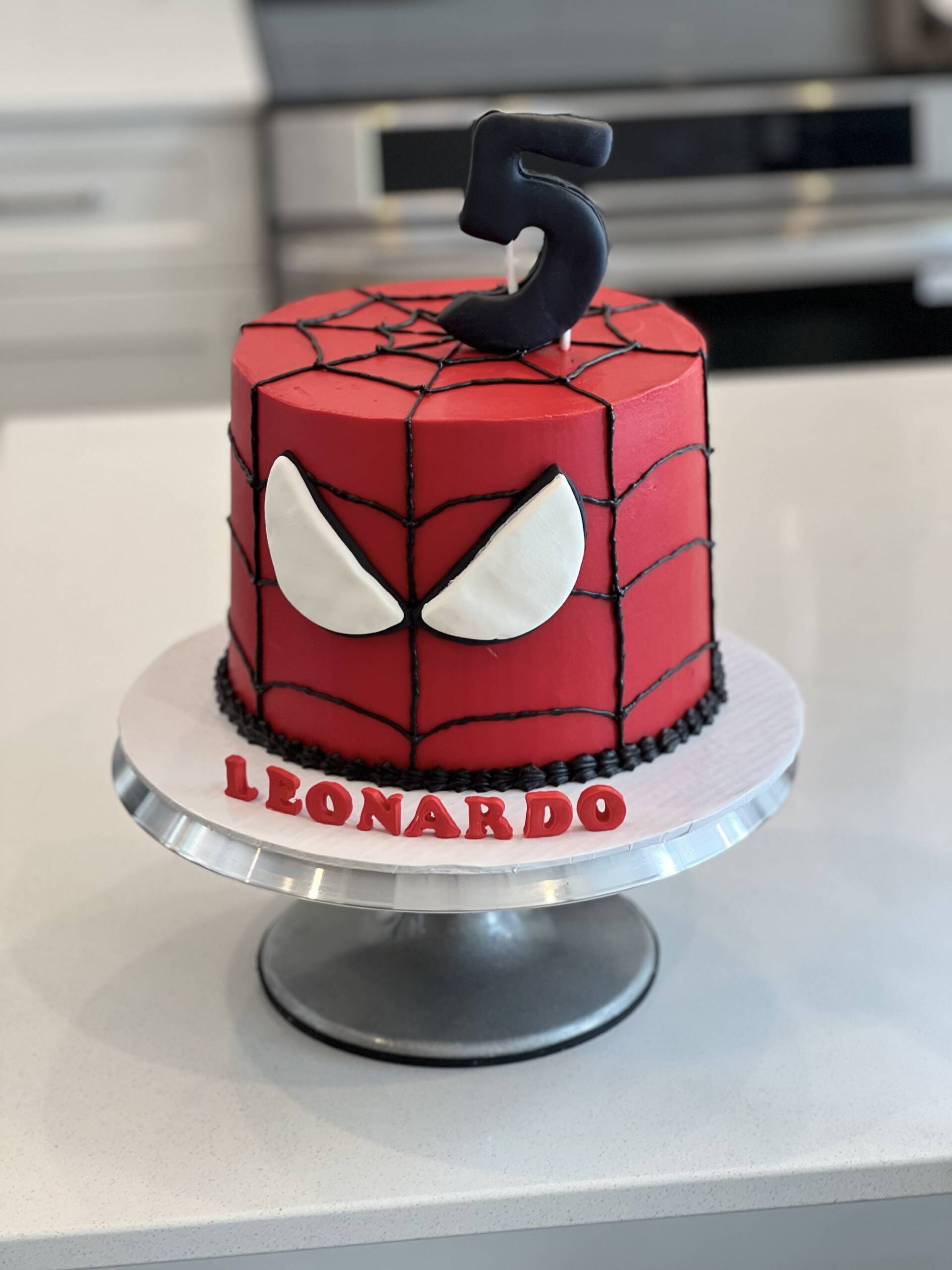 A striking red buttercream cake inspired by the classic Spider-Man design. This cake features clean black web piping, bold fondant eye panels, and a handcrafted number topper to match the theme. Ideal for young superhero fans…