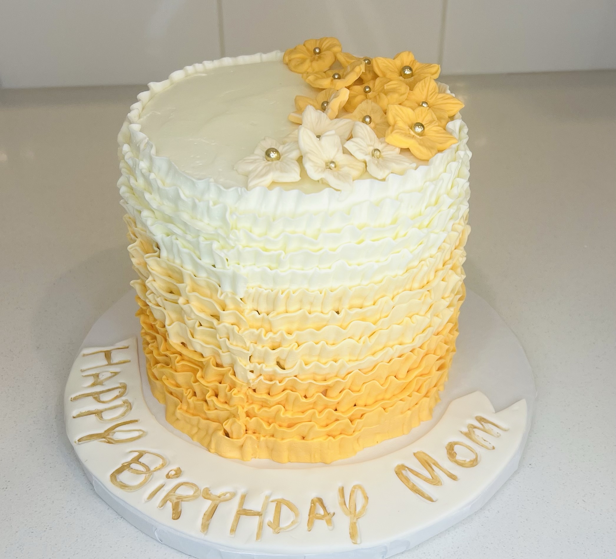 A beautifully crafted 6-inch layered buttercream cake designed in elegant ombre shades of ivory and gold. The sides are decorated with hand-piped buttercream ruffles, blending from rich golden tones at the base to creamy ivory at the top for a smooth, elegant gradient.