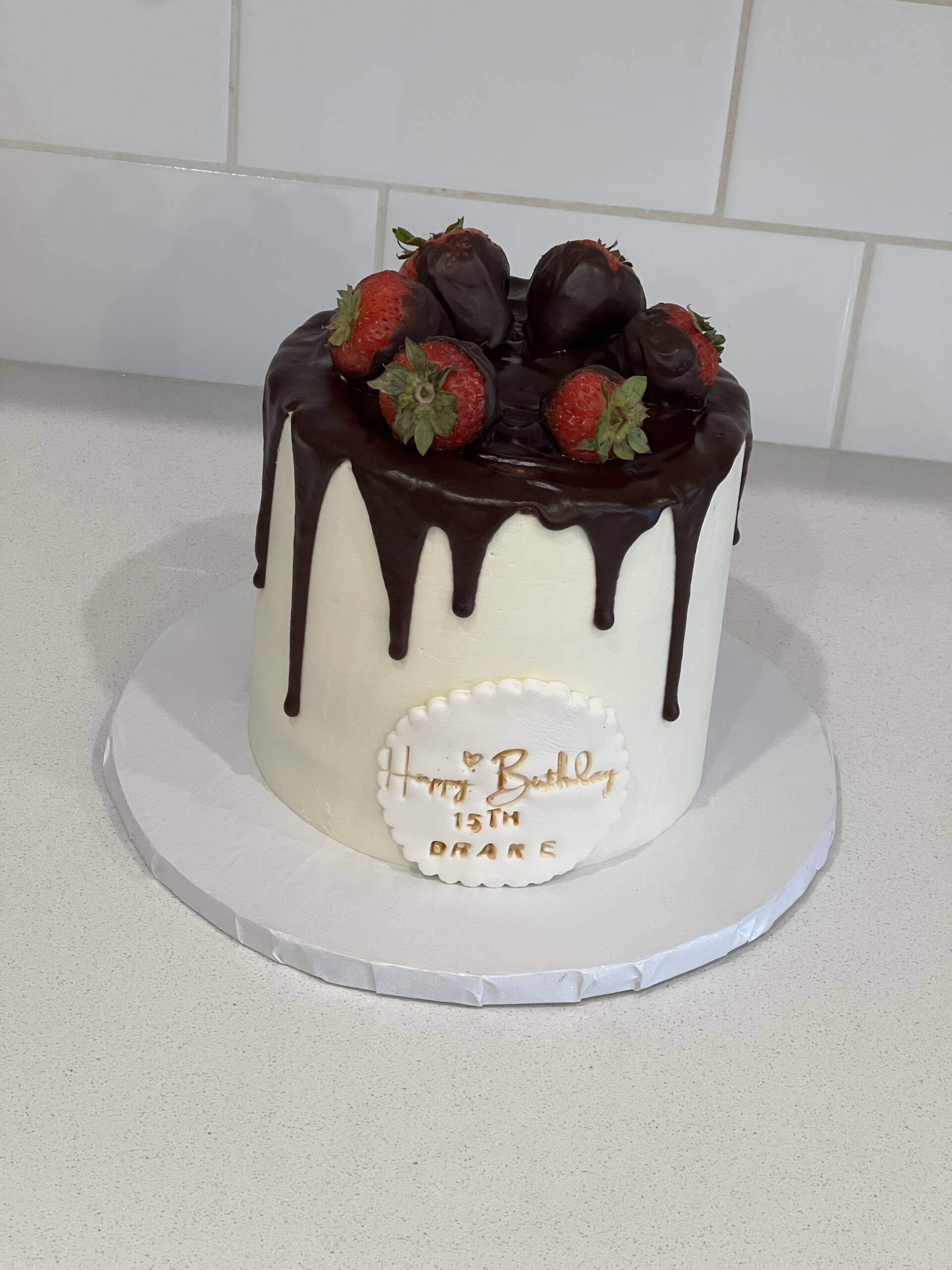 This elegant cake features smooth vanilla buttercream covered with a glossy dark chocolate drip that cascades beautifully down the sides. Topped with fresh strawberries hand-dipped in rich chocolate and accented with delicate white chocolate drizzle, it’s both a feast for the eyes and the taste buds. A simple buttercream border at the base adds a soft finishing touch, making this cake perfect for birthdays, anniversaries, or any special celebration.